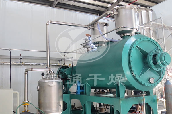 本機是一種新穎臥式間歇式真空干燥設備,濕物料經傳導蒸發,帶有刮板攪拌器不斷清除熱面上的物料,并在容器內推移形成循環流,水份蒸發后由真空泵抽出。